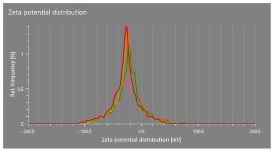 Zeta potential distribution of CuO NPs in T4. Different colors represent the zeta potential distribution of different replicates.