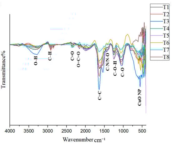 FTIR spectrum of CuO NPs in each treatment.
