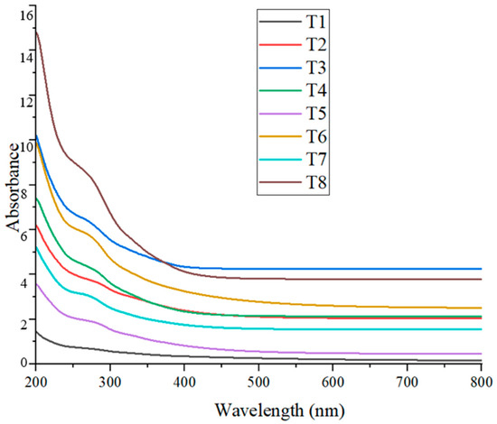 The presence of CuO nanoparticles in the colloidal solution was confirmed through UV–Visible spectrophotometry. The absorption peaks of the synthesized CuO NPs in this study ranged from approximately 265 nm to 285 nm (Figure 6), with slight variations observed across different treatments (Table 4). These values fall within the expected range for CuO nanoparticles, indicating successful nanoparticle formation.