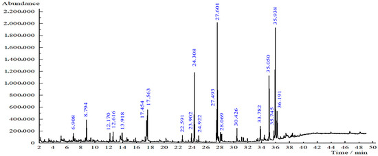 The initial oven temperature was maintained at 50 °C. Helium was used as the carrier gas at a constant flow rate of 1 mL/min, and an HP-5MSUI capillary column (30 m × 0.250 mm × 0.25 μm) was used as the stationary phase. Following standard procedures, 1 μL of the sample was injected into the GC-MS (Agilent 5977B GC/MSD, Santa Clara, CA, USA). The oven temperature program began at 100 °C, increased to 110 °C at a rate of 10 °C/min, and then ramped to 280 °C at a rate of 5 °C/min, which was held for 9 min. The total run time was 49 min. The flow was split at a ratio of 10:1 before introduction into the MS detector. Mass spectral data were acquired using an MS detector (Agilent 8890 GC system, Santa Clara, CA, USA) in electron impact (EI) scan mode at 70 eV, with a mass scan range of 40–550 m/z. Spectral data were obtained using the MSD Enhanced ChemStation F.01.03.2357 provided by Agilent, Santa Clara, CA, USA. The resulting spectra were compared with entries in the NIST/EPA/NIH Mass Spectral Library using the Automatic Mass Spectral Deconvolution and Identification System (AMDIS) program and the NIST Mass Spectra Search program.