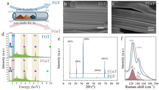 (a) Schematic flow chart of the crystal growth processes for FGT and FGaT, (b,c) representative cross-sectional SEM images of FGT (b) and FGaT (c), (d) EDS spectra of FGT and FGaT, (e) XRD patterns of FGT and FGaT, (f) Raman spectra of FGT and FGaT with deconvolution of FGT into E2g and A1g modes.