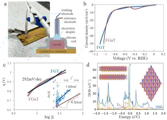 Using this setup, we conducted linear sweep voltammetry (LSV) in a 0.5 M H2SO4 solution to examine the catalytic activity of FGT and FGaT. (Raw data and extracted peak parameters are provided in the Supplementary Materials). The measured overpotential for FGT is 0.85 V (Figure 2b), which is significantly higher than values reported in previous studies. This disparity highlights the substantial role that edge sites played in earlier experiments using exfoliates or powders.