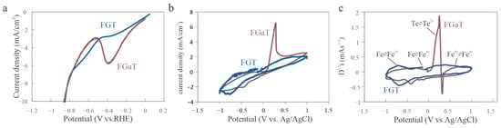 Yet, closer investigation of the LSV data shows that this interpretation is incomplete. An unexpected peak in the FGaT curve at approximately −0.4 V vs. RHE occurs (Figure 3a). Although this feature has been previously seen in studies of exfoliated FGT, it has not been investigated []. To further probe this anomaly, we conducted cyclic voltammetry (CV) on both materials in the same electrolyte. To ensure accurate comparison, the CV curves were normalized by the capacitive background charge, accounting for differences in crystal surface area. The resulting curves were largely similar, but a pronounced deviation was observed in the anodic branch of FGaT, suggesting a fundamental difference in oxidative behavior (Figure 3b).