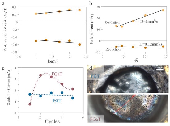 Electrochemical degradation behavior. (a) CVs at different scan rates, showing increasing peak separation with scan rate, indicating kinetic limitations. (b) Scan rate–dependent analysis of peak current, revealing diffusion-limited and irreversible oxidation behavior. (c) Cycling data comparing performance degradation in FGT and FGaT. (d) Horizontally split arrangement of two optical microscopy images post-cycling, showing retention of flat surface in the FGT case (top) and visible degradation in FGaT (bottom), consistent with surface corrosion.