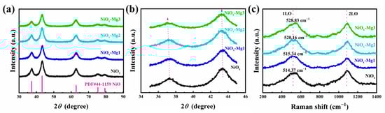 (a) XRD patterns of NiOx, NiOx-Mg1, NiOx-Mg2, and NiOx-Mg3 films. (b) XRD local amplification diagram. (c) Raman spectra of the Mg-doped NiOx films.