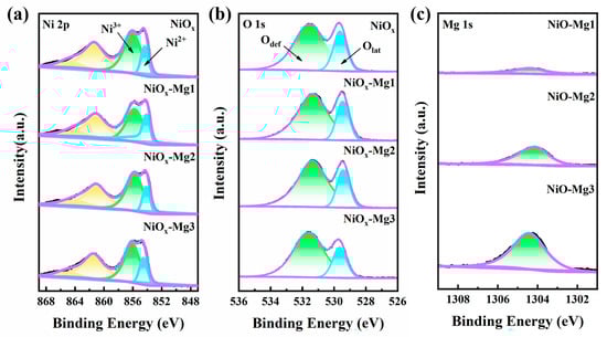 To explore the surface composition and chemical state of the films, XPS measurements were carried out on the original NiOx and Mg-doped NiOx films. As shown in Figure 3, the characteristic satellite peak of Ni 2p appears near 862 eV, confirming that nickel exists in the form of a mixed valence state (Ni2+/Ni3+), which is consistent with the electronic structure characteristics of typical nickel oxides [19]. The results show that the binding energies of Ni2+ and Ni3+ of the intrinsic NiOx are located at 854.35 eV and 856.05 eV, respectively (see Table S1). With the change in the Mg doping concentration gradient, the Ni 2p peak of the low-doping groups (NiOx-Mg1 and NiOx-Mg2) shows a negative shift of 0.2–0.4 eV, while the high-doping group (NiOx-Mg3) shows a positive shift of about 0.3 eV. In addition, as the doping amount of Mg2+ increases, the ratio of Ni3+/Ni2+ shows an upward trend. This might be due to the fact that Mg ions caused some nickel vacancies during the doping process. To maintain charge neutrality, some Ni2+ was oxidized to Ni3+, thereby increasing the relative content of Ni3+ [19,35]. O 1s can be decomposed into two main components: lattice oxygen (Olat) and oxygen defects (Odef) [36]. The peak located at 529.55 eV is attributed to Olat, indicating that O forms a stable oxide structure with Ni; the peak located at 531.50 eV is attributed to Odef (oxygen interstitials and oxygen vacancies), corresponding to the O2− state in the oxygen defect region [37]. By calculating the ratio of Odef/Olat (Table S1), it is found that the ratio of Odef/Olat gradually increases with the increase in the doping ratio, indicating that Mg doping introduced oxygen interstitials and oxygen vacancies in the NiOx film. The Mg 1s peak is located at 1304.5 eV, indicating that Mg ions are successfully doped into the nickel oxide film.