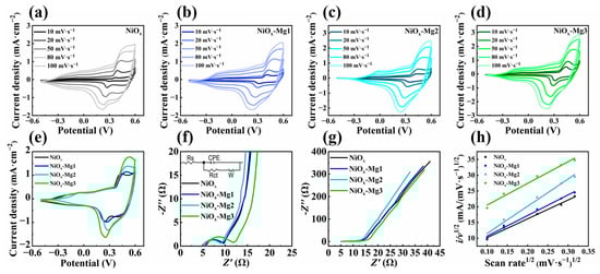 The electrochemical behaviors of the original NiOx and Mg-doped NiOx electrode systems were systematically characterized by cyclic voltammetry (CV). The experiment was carried out in the 1 M KOH electrolyte system, with the potential window set from −0.6 V to 0.6 V (vs. reference electrode) and the scanning rate gradient set at 10–100 mV·s−1. As shown in Figure 4a–d, with the increase in the scanning rate, the integral area of the CV curve showed an upward trend, and the anodic oxidation peak potential shifted positively. This is because at a high scanning rate, the rapid polarization of the electric double layer at the electrode–electrolyte interface causes the mass transfer rate to lag behind the electron transfer rate [38]. Further comparative analysis of CV at the 50 mV·s−1 scanning rate (Figure 4e) revealed that with the increase in the Mg doping concentration, the integral area of the CV curve of the electrode material showed a significant increasing trend, accompanied by the displacement of the redox characteristic peaks. This is because Mg doping induces the formation of oxygen defects, significantly increasing the density of active sites on the surface and leading to an increase in the integral charge.