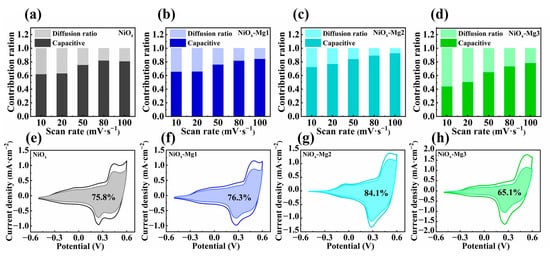 The capacitance contribution and diffusion contribution of (a–d) NiOx and Mg-doped NiOx films at different scan rates. The pseudocapacitance ratio of (e–h) NiOx and Mg-doped NiOx films at 50 mV·s−1 scan rate.