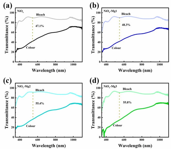 In situ transmission spectra of (a) NiOx and (b–d) Mg-doped NiOx films at +0.6 V/−0.6 V potential.