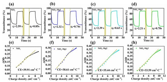 The transmittance–time response curves of (a–d) NiOx and Mg-doped NiOx films at 500 nm are shown. Coloring efficiency of (e–h) NiOx and Mg-doped NiOx films.