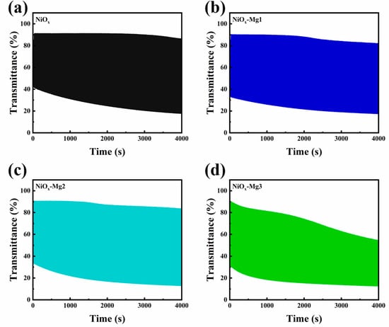 A systematic study based on the potentiostatic polarization method was performed to comprehensively evaluate the influence of Mg doping on the cycling stability of NiOx electrode materials. The double-potential step method was used in the experiment (coloring state: +0.6 V vs. Ag/AgCl; bleaching state: −0.6 V vs. Ag/AgCl), and each potential was maintained for 10 s to guarantee that the system reached a steady state. As shown in Figure 8, the pristine NiOx electrode exhibited excellent cycling stability within the test range of 4000 s. Slight performance degradation of the lightly doped samples (NiOx-Mg1, NiOx-Mg2) began to occur around 2000 s, while the heavily doped sample (NiOx-Mg3) showed significant performance degradation from the beginning, and the degradation rate increased with time. The light absorption of all samples in the colored state showed a gradually increasing trend, which might be attributed to the gradual activation of active sites on the electrode surface during the cycling process [45].