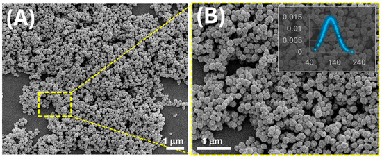 Figure 1. SEM images (secondary electrons, 5 kV) of linalool-imprinted polymer nanoparticles (MIP-NPs) obtained by precipitation polymerization, shown at two different magnifications: (A) overview of the nanoparticle distribution; (B) magnified view highlighting the spherical-to-faceted morphology and moderate surface roughness. The inset in panel (B) reports the normalized size distribution of particle diameters, with an average diameter of 135 ± 28 nm (mean ± standard deviation, n = 100).