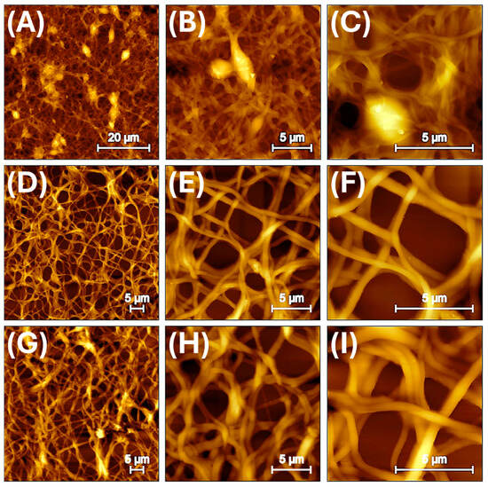 Atomic force microscopy (AFM) was employed to evaluate the morphological changes and surface topography of electrospun nanofibres as a function of increasing MIP nanoparticle loading. Nanofibres incorporating varying weight percentages of MIP nanoparticles synthesized with linalool as template were analysed to assess fibre diameter, surface roughness, and structural features such as bead formation. This analysis aims to elucidate the influence of MIP nanoparticle incorporation on the nanoscale architecture and surface properties of the fibres. At low MIP concentration (2.1%) (Figure 2A–C), the AFM images reveal a well-interconnected network of thin fibres forming a dense, fibrous mat. The samples are arranged vertically from top to bottom in order of increasing MIP content, while the horizontal arrangement from left to right corresponds to increasing magnification. A noticeable number of beads are present along the fibre axis, which is consistent with the effects of lower polymer solution viscosity as previously observed in electrospun PVP/MIP systems incorporating MIPs for limonene [37].