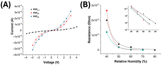 Figure 5. (A) I–V curves of electrospun nanofibre mats incorporating different amounts of MIP nanoparticles (MIP2.1—black, MIP23—red, MIP40—blue), measured under humid conditions (RH: 60%). The current response increases with MIP loading, indicating enhanced charge transport across the nanofibrous matrix due to the presence of conductive pathways facilitated by the MIP-NPs. (B) Variation in electrical resistance as a function of relative humidity (RH) for the same materials.