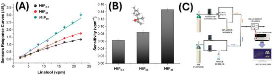 Figure 6. (A) Sensor response curves (ΔI/I0) of electrospun MIP-based nanofibres incorporating increasing MIP-NP loadings (MIP2.1, MIP23, and MIP40), measured under exposure to ascending linalool concentrations (2–22 vpm) at 60% relative humidity. (B) Sensitivity values defined as the slope of the linear response (ΔI/I0 vs. concentration) extracted from the linear fits in panel (A) and expressed in vpm−1. The 3D structure in the panel corresponds to a linalool molecule, the template used for imprinting. (C) A schematic diagram of the gas sensing measurement setup.