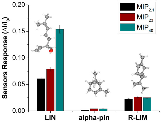 Figure 7. Bar plot of comparative sensor responses (ΔI/I0) of nanofibrous mats containing different MIP-NP loadings (MIP2.1, MIP23, and MIP40) exposed to 1 vpm of three different monoterpenes, linalool (LIN), α-pinene (alpha-pin), and R-(+)-limonene (R-LIM), all measured at 60% RH.