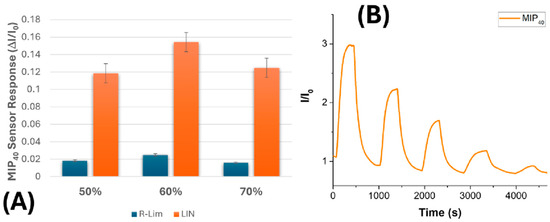 Figure 8. (A) The selective response of the MIP40 sensor to 1 vpm linalool (LIN, orange bar) and R-(+)-limonene (R-LIM, blue bar) at three different relative humidity levels (50%, 60%, and 70%). (B) The transient sensor response curve (I/I0) of the MIP40 formulation upon exposure to a descending concentration sequence of linalool vapour (22, 15, 10, 5, and 2 vpm) at 60% RH.