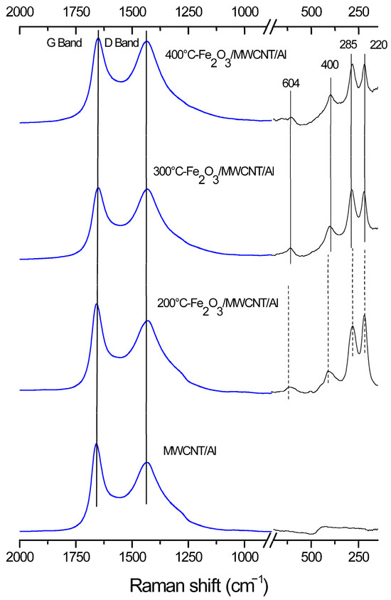 Raman shifts of MWCNT/Al and Fe2O3/MWCNT/Al (200, 300, and 400 °C).