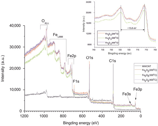 Long scan of the XPS spectrum with the inset showing the high-resolution Fe2p region of MWCNT/Al and Fe2O3/MWCNT/Al (200, 300, and 400 °C).