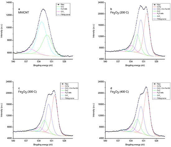 XPS spectrum (O1s) of (a) MWCNT/Al, (b) 200 °C—Fe2O3/MWCNT/Al, (c) 300 °C—Fe2O3/MWCNT/Al, and (d) 400 °C—Fe2O3/MWCNT/Al.