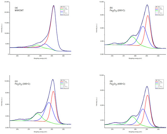XPS spectrum (C1s) of (a) MWCNT/Al, (b) 200 °C—Fe2O3/MWCNT/Al, (c) 300 °C—Fe2O3/MWCNT/Al, and (d) 400 °C—Fe2O3/MWCNT/Al.