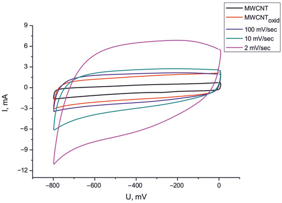 The cyclic voltammetry method showed a significant increase in the capacitance of the MWCNT/Al samples after the formation of the Fe2O3/MWCNT/Al composite material. Figure 6 shows examples of cyclic voltammograms for the initial MWCNT/Al samples, the electrochemically oxidized samples, and the composite material obtained at different voltage sweep rates.