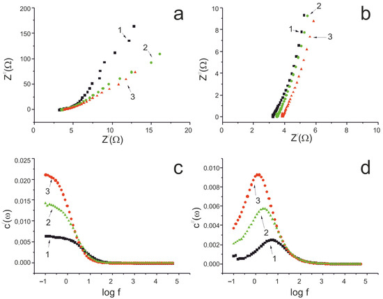 (a) Nyquist plots for a three-electrode cell (full range); (b) Nyquist plots for a three-electrode cell (middle range); (c) frequency dependence of real capacitance; and (d) frequency dependence of imaginary capacitance. As-prepared MWCNT/Al sample—1; oxidized MWCNT/Al sample—2; and Fe2O3/MWCNT/Al sample—3.