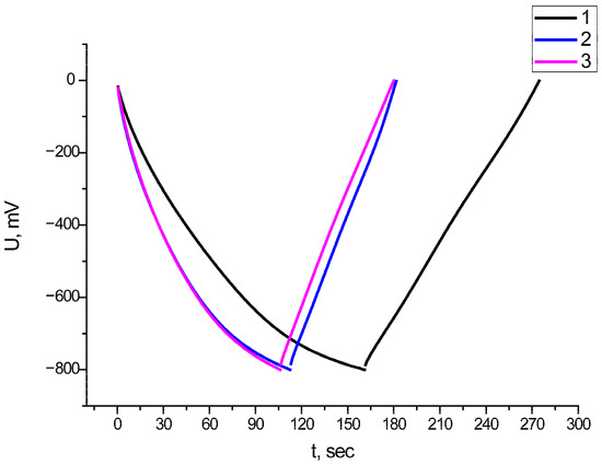 GCD of initial electrode: 1—composite obtained at a temperature of 200 °C; 2—composite obtained at a temperature of 300 °C; and 3—composite obtained at a temperature of 400 °C.