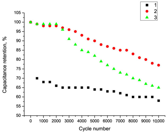 Capacitance evolution of Fe2O3/MWCNT/Al composite during multiple charge–discharge cycles as a function of annealing temperature: 1—composite obtained at a temperature of 200 °C; 2—composite obtained at a temperature of 300 °C; and 3—composite obtained at a temperature of 400 °C.