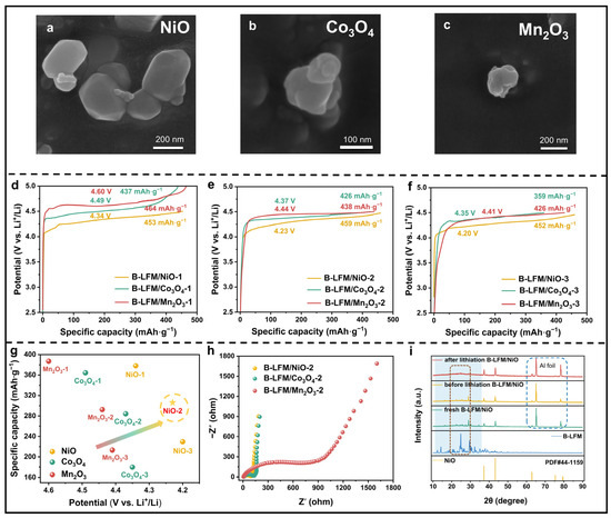 SEM images of (a) NiO, (b) Co3O4, and (c) Mn2O3. The GCD of (d) B-LFM/catalyst-1, (e) B-LFM/catalyst-2, and (f) B-LFM/catalyst-3. (g) Comparison of decomposition voltages and actual specific capacities of catalysts in different proportions. (h) Nyquist plots of B-LFM/catalyst-2 after 10 cycles. (i) XRD patterns of B-LFM/NiO-2 during the electrochemical process.