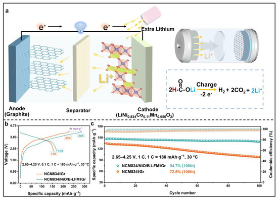 The pristine electrode was fabricated by mixing NCM834 (80 wt.%), AB (10 wt.%), and PVDF (10 wt.%), while the modified electrode (NCM834/NiO/B-LFM) was prepared by blending the NCM834, B-LFM, NiO, AB, and PVDF with mass ratios of 6:1 between the NCM834 and B-LFM and 4:2 between the lithium formate and NiO. The graphite electrode was composed of 70 wt.% graphite, 15 wt.% AB, and 15 wt.% carboxymethyl cellulose (CMC).