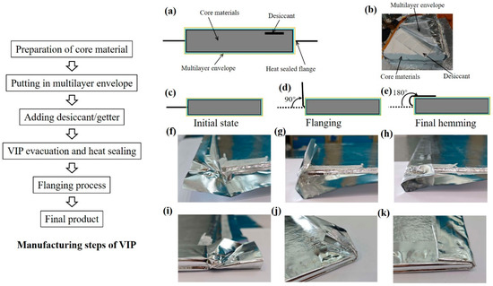 Schematic of the manufacturing process, including structure assembly, vacuum sealing, and post-processing. (a) Schematic and (b) real images of a VIP structure. Schematic illustration of the flanging process: (c) initial state, (d) flanging 90°, (e) final hemming state. Optical image of the flanging process: (f–h) correspond to the actual images of schematic (c–e), (i–k) are actual images of the adjacent-edge repetition process for (c–e).