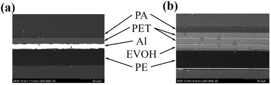Cross-section images of (a) laminated aluminum foil (AF), and (b) multilayer membrane with metallized films (MFs).
