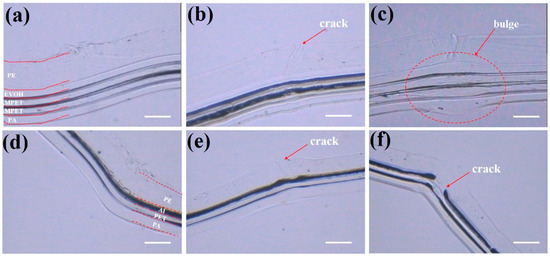 The observed degradation in thermal conductivity and gas barrier performance indicates that repeated bending compromises the integrity of the barrier film, accelerating gas permeation and contributing to vacuum failure. To investigate the underlying microscopic mechanisms responsible for this deterioration, this study systematically analyzes the evolution of cross-sectional morphology under varying bending cycles (n = 1, 3, 5) using optical microscopy. The results demonstrate a clear correlation between the formation of micro-cracks and the development of microleakage pathways. Figure 4a illustrates the well-defined five-layer architecture of MFs, consistent with the structural schematic representation in Figure 2b. Following three bending cycles, the overall structural integrity is maintained, but distinct cracking is induced in the PE layer (Figure 4b). The overall thickness of the material increased significantly from ~112 μm to ~155 μm after five bending cycles (Figure 4c). This substantial thickening suggests volumetric expansion within the layered structure, which is attributed to interfacial delamination between layers. Such delamination could create localized voids or gaps that contribute to the observed thickness change, even if not directly visible in the cross-sectional image. The blister-like features at the fold lines exhibit a bidirectional bulge rather than a unidirectional deformation. This symmetric expansion is inconsistent with simple plastic deformation or buckling, which typically produces curvature in a single direction. Instead, it strongly implies interfacial separation, where adjacent layers detach and displace outward, forming internal pores that manifest as surface bulges. These observed mechanical failures correlate directly with the measured 340% increase in WVTR and the 22% enhancement in oxygen permeability demonstrated in Figure 3a,b. Progressive delamination of the EVOH interlayer under repeated stress, creating tortuous pathways for water vapor permeation. Pinhole coalescence in the nanoscale Al coating, which amplifies permeation exponentially once interconnected cracks form (critical threshold reached at cycle 5). In contrast, AFs exhibited differential failure mechanisms despite sharing a similar four-layer construction (Figure 4d). While comparable PE layer fracturing occurred after three cycles (Figure 4e), advancing to five bending cycles provoked complete fracture of the aluminum metallization layer (Figure 4f). This observed aluminum layer fragmentation, which conflicts with bulk aluminum’s inherent ductility, arises from two synergistic mechanisms inherent to the laminated system. First, during edge folding, the asymmetric mechanical constraints imposed by the 50 μm-thick PE layer and 30 μm-thick PA/PET composite layer subject the 15 μm-thick aluminum foil to localized compressive stresses at bending radii approaching 180° (Figure 1). These constraints exceed the local ductility limit of the metallization layer, initiating fracture nucleation. Second, cyclic bending induces fatigue-driven damage accumulation, with interfacial strain concentrations progressively weakening the aluminum layer until catastrophic crack propagation and interfacial delamination occur. While bulk aluminum demonstrates excellent macroscopic ductility, the confined geometry and multilayer interactions in this system generate unique stress states that override the material’s intrinsic plasticity, ultimately compromising both thermal conduction and barrier functionality.