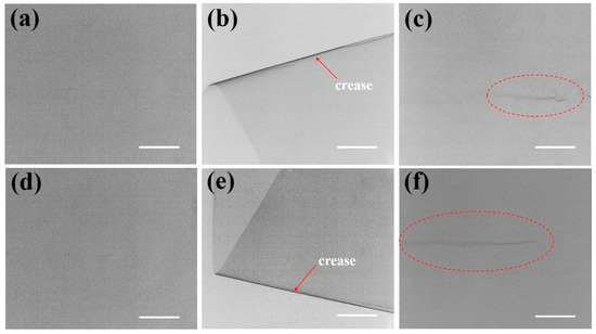 Optical micrographs of the samples were captured via a transmission-based imaging system (WV-CP490/CH, Panasonic, Kadoma, Osaka, Japan). Rectangular sections measuring 1.5 mm × 20 mm were prepared for cross-sectional analysis. Emphasis was placed on assessing crease morphology within predefined folding regions subjected to 1, 3, and 5 cycles of folding.