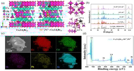 (a) Schematic diagram of the crystal structure of Cs7Cd3Br13 and Cs7Cd3Br13: Sb3+/Pb2+. (b) XRD patterns of Cs7Cd3Br13, Cs7Cd3Br13:Pb2+, Cs7Cd3Br13:Sb3+, and Cs7Cd3Br13:Sb3+/Pb2+ crystals (left), with the yellow dashed rectangle delineates the 2θ range of 20.6°–21.3°. Enlarged images of XRD spectra at the 2θ range of 20.6°–21.3° (right), with the yellow dotted line denotes the position corresponding to 2θ of 20.8°. (c) SEM image of Cs7Cd3Br13:0.5%Sb3+, 4%Pb2+ single crystal and EDS mapping images of Cs, Cd, Sb, Pb, and Br elements in Cs7Cd3Br13:0.5%Sb3+, 4%Pb2+ crystal. (d) The XPS surveys of Cs7Cd3Br13:0.5%Sb3+, 4%Pb2+.