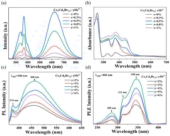 The PLE and PL spectra of Cs7Cd3Br13 and Cs7Cd3Br13:x%Sb3+ samples are shown in Figure 2a. The undoped Cs7Cd3Br13 has a very weak emission band at 615 nm. Compared with the original Cs7Cd3Br13, the PL intensity after doping Sb3+ is significantly enhanced, emitting bright orange emission near 620 nm with a full-width-at-half-maximum (FWHM) of 145 nm under 370 nm excitation. Whose 620 nm band of Cs7Cd3Br13:x%Sb3+ has a Stokes shift of 250 nm, which indicates that its self-absorption is negligible, resulting in efficient emission out of the STE. With the increasing Sb3+ doping, the emission intensity first increases and then decreases due to the concentration quenching effect, and the emission intensity reaches its maximum when the Sb3+ doping concentration is 0.5%. Figure 2b displays the optical absorption spectra of undoped Cs7Cd3Br13 and Cs7Cd3Br13:x%Sb3+ samples. The characterization results indicate that the undoped Cs7Cd3Br13 shows a distinct absorption edge at 295 nm. Below this edge, there are three weak bands at 330, 370, and 460 nm that may be the absorption of the STEs for their complicated structures in this compound. This STE emission at about 615 nm and PLE can be verified by Figure 2a, which is well in agreement with the absorption spectra. The PLE spectra of the undoped Cs7Cd3Br13 and its doped Sb3+ are shown on the left of Figure 2a, which more clearly show several excitation peaks at 292, 303, 322, 332, and 375 nm, consistent with the reported literature [45]. The absorption spectra of Sb3+ doped samples exhibit a series of new absorption bands in the region of 280–500 nm, that of the charge transfer out of the Sb-Br-Cd octahedron. The excited states of Sb3+ ions (ns2 electronic configuration) have singlet and triplet states in the gap, where 1S0→1P1 transitions are allowed, 1S0→3P1 is partially allowed to transition, and 1S0→3P2 and 1S0→3P0 transitions are forbidden [46,47]. Below the band out of Sb in the range 450–540 nm, there are two bands possibly from the Cd states due to the Sb and Cd d orbital interactions, which give no emissions or low Cd STE emission.