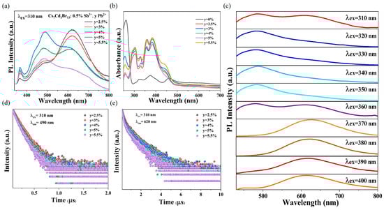 (a) PL spectra of Cs7Cd3Br13:0.5%Sb3+, yPb2+ (y = 2.5–5.5%). (b) Optical absorption spectra of the Cs7Cd3Br13:0.5%Sb3+, yPb2+ sample. (c) PL spectra of Cs7Cd3Br13:0.5%Sb3+, 4%Pb2+ samples under different excitation. (d) Decay curve of Cs7Cd3Br13:0.5%Sb3+, yPb2+ sample under 310 nm laser irradiation (monitored at 490 nm). (e) Decay curve of Cs7Cd3Br13:0.5%Sb3+, yPb2+ sample under 310 nm laser irradiation (monitored at 620 nm).