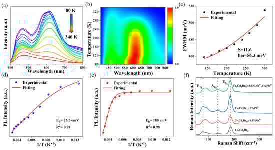 Figure 4f shows the Raman spectra of Cs7Cd3Br13 and Cs7Cd3Br13:0.5%Sb3+, y%Pb2+ under 532 nm laser resonant excitation. It can be seen from Figure 4f that the lattice vibration mode of the doped sample does not change significantly after Sb3+ and Pb2+ replace Cd2+ [40]. Three Raman patterns are observed at 79, 150, and 184 cm−1. The 79 cm−1 pattern exhibits a blue shift after doping Sb3+. This may be due to the enhanced electron–phonon coupling leading to enhanced interaction between electrons and lattice vibration for small polaron formation, while the strongest in this range is the 184 cm−1 mode, which favors the formation of the large polaron for this phonon, coupled to the photoinduced carriers. Based on the temperature-dependent PL profile shown in Figure 4b, with the transition point at 100–120 K, we found that the small polaron by 79 cm−1 mode is critical for this system, but not the 184 cm−1 mode. This implies that the latter mode shows a minor ratio for the polaron formation. The 79 cm−1 mode is far from the value of 56.3 meV fitted from Equation (3); this difference indicates multiphonon coupling effect dominates in the STE emission, especially in the Sb3+ sites, which represents a significant nonlinear effect in their electron–phonon coupling and other physical interactions, just as in those perovskite structures [53,54].