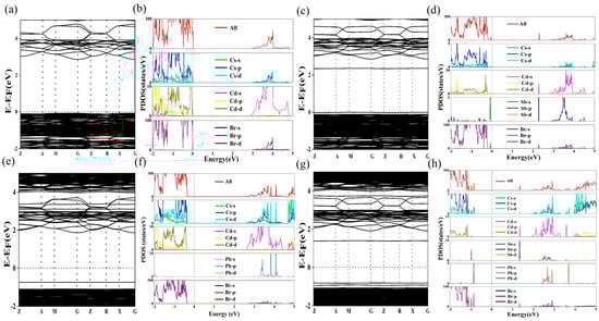 Band structures of (a) Cs7Cd3Br13, (c) Sb3+ doped Cs7Cd3Br13, (e) Pb2+ doped Cs7Cd3Br13, (g) Sb3+/Pb2+ co-doped Cs7Cd3Br13. Total density of states (TDOS) and projected density of states (PDOS) of (b) Cs7Cd3Br13, (d) Sb3+ doped Cs7Cd3Br13, (f) Pb2+ doped Cs7Cd3Br13, (h) Sb3+/Pb2+ co-doped Cs7Cd3Br13.