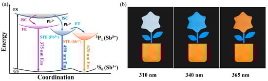 (a) Diagram of the luminescence mechanism of Cs7Cd3Br13:Sb3+/Pb2+. (b) Fluorescent anti-counterfeiting patterns (“potted”) made by Cs7Cd3Br13:0.5%Sb3+ (pot), Cs7Cd3Br13:5%Pb2+ (leaves), and Cs7Cd3Br13:0.5%Sb3+, 4%Pb2+ (flowers).