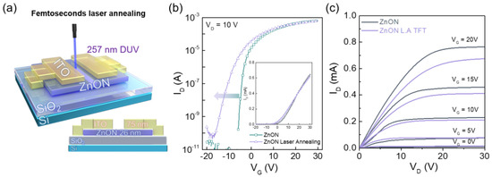 (a) Schematic illustration of ZnON TFT structure under DUV fs laser annealing. (b) Transfer characteristics of ZnON TFTs before and after laser annealing (inset: linear-scale plot). (c) Output characteristics of pristine and ZnON L.A. TFTs.