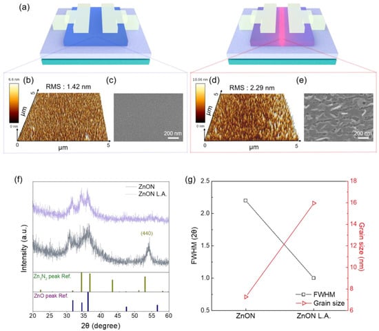 (a) Schematic illustration of ZnON TFT and ZnON L.A. TFT. (b) Surface roughness of the ZnON film analyzed by AFM, with an RMS value of 1.42 nm. (c) Surface SEM image of the ZnON film. (d) Surface roughness of the ZnON L.A. film analyzed by AFM, showing an RMS value of 2.29 nm. (e) Surface SEM image of the ZnON L.A. film. (f) X-ray diffraction (XRD) patterns of ZnON and ZnON L.A., with reference peaks of Zn3N2 and ZnO. (g) Grain size estimated from the FWHM of the ZnO (100) peak.
