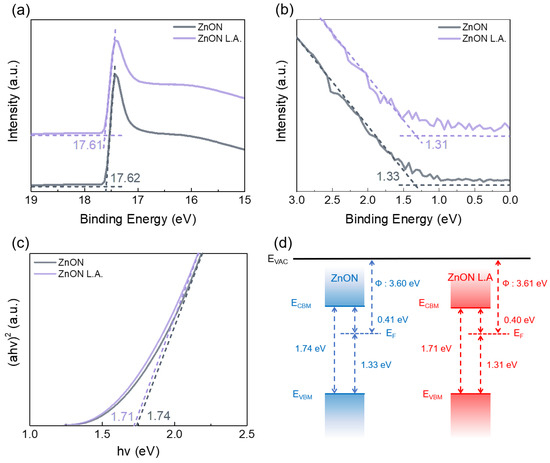 To analyze the band structure of ZnON before and after laser annealing, ultraviolet photoelectron spectroscopy (UPS) and Tauc plot analyses were conducted. Figure 3a presents the secondary electron cutoff region obtained from the UPS spectra. By subtracting the cutoff energy from the photon energy (21.22 eV), the work function (Φ) was calculated [34], yielding values of 3.60 eV for pristine ZnON and 3.61 eV for laser-annealed ZnON. Figure 3b shows the valence band edge with respect to the Fermi level, extracted from the linear extrapolation of the UPS spectra, which indicates the energy separation between the Fermi level and the valence band maximum (VBM). Optical transmittance was measured over a wavelength range of 300–1000 nm, as shown in Figure S5a, and the corresponding absorbance spectrum is shown in Figure S5b. Using the absorbance data, the optical band gap was estimated through Tauc plot analysis (Figure 3c) [35], where linear extrapolation was used to determine the cutoff point. The extracted band gap slightly decreased from 1.74 eV (pristine) to 1.71 eV (laser-annealed). Based on the measured values of work function, VBM position, and optical band gap, energy band diagrams were constructed (Figure 3d). The overall band alignment of pristine ZnON and ZnON L.A. remained nearly unchanged. The negligible difference in energy between the Fermi level and the conduction band minimum (CBM) suggests that electron injection and transport characteristics are largely preserved after laser annealing.