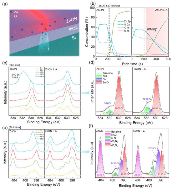 (a) Schematic of Zn and O atomics diffusing into the substrate. ZnON film and ZnON L.A film XPS analysis, (b) atomic concentration of depth profile, (c) XPS spectra of O 1s at different etching times (checking for tendency match), and (d) O 1s peak of etch time of 180 s. (e) XPS spectra of N 1s at different etching time and (f) N 1s peak at etch time of 180 s.