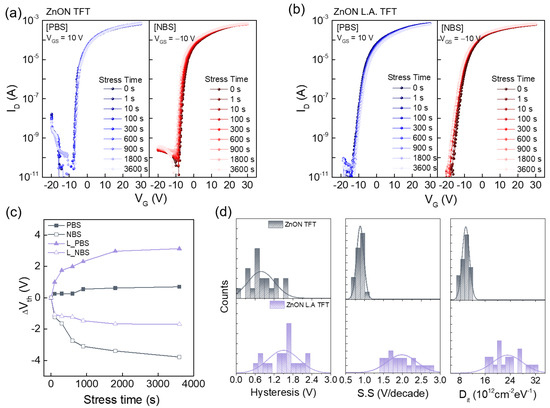 Bias stress stability analysis of (a) ZnON TFT and (b) ZnON L.A. TFT. (c) Vth shifts as a function of stress time under PBS and NBS. (d) Histogram statistics of hysteresis, S.S, and Dit values. Twenty devices were measured for statistical analysis.