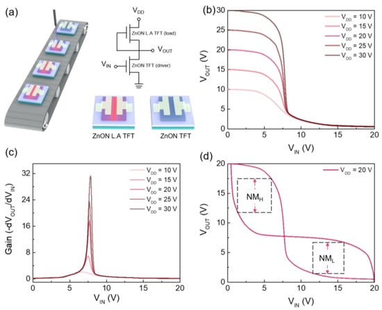 Finally, an NMOS inverter was fabricated using ZnON TFT and ZnON L.A. TFT. As illustrated in Figure 6a, the ZnON L.A. TFT serves as the load, while the pristine ZnON TFT is used as the driver. The devices were fabricated on separate substrates and electrically connected via external wiring. The corresponding circuit diagram is depicted in Figure 6a. Figure 6b presents the voltage transfer characteristics (VTC) of the inverter, measured by sweeping the input voltage (VIN) from 0 V to 20 V under supply voltages (VDD) ranging from 10 V to 30 V. Based on the VTC curve, the voltage gain and noise margin were evaluated. The voltage gain, defined as the maximum slope of the VTC curve, is plotted in Figure 6c, with a peak gain of 31 observed at VDD = 30 V. Noise margins were extracted from the VTC at VDD = 20 V, as shown in Figure 6d [45]. The high and low noise margins (NMH and NML) were calculated as NMH = VOH − VIH = 5.84 V and NML = VIL − VOL = 5.34 V, corresponding to 58% and 53% of VDD/2, respectively. These values are indicative of stable inverter operation with clear logic level distinction. The results highlight the feasibility of applying the demonstrated logic implementation to future integrated systems, including selectively annealed CMOS inverters, gas sensors, memory arrays, and OLED-based mesh electronics.