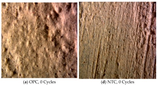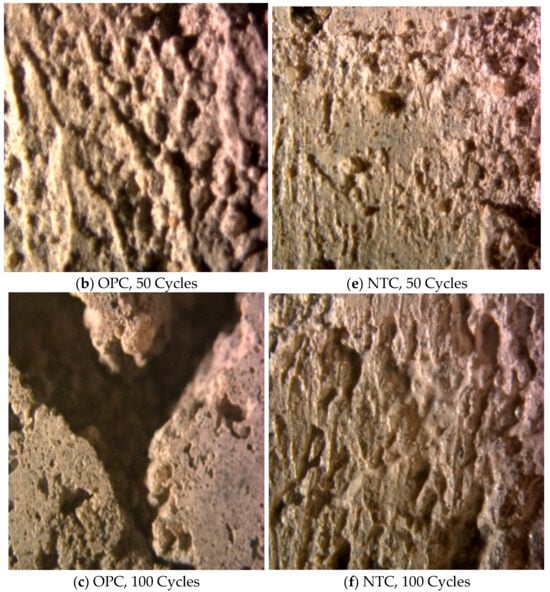 Macroscopically, no significant damage was observed on the specimens following freeze–thaw exposure. However, microstructural deterioration was examined using a stereomicroscope at 60× magnification, as illustrated in Figure 2. Under ambient conditions, the surface of the NTC was notably smoother compared to that of the plain concrete. After 50 freeze–thaw cycles, the plain concrete surface began exhibiting pronounced roughness and irregularity. By the 100th cycle, large surface pores had developed. This progressive deterioration is primarily attributed to the freezing and expansion of water within the capillary pores of the cement matrix at low temperatures. Repeated freeze–thaw cycling led to gradual enlargement and collapse of these pores. Under magnification, the initiation and propagation of surface porosity in the plain concrete were clearly visible.