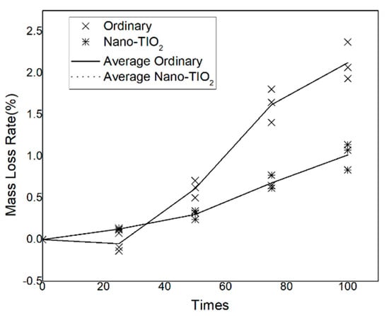 In the case of NTC, the mass loss rate after 20 F–T cycles is only 0.126%, indicating excellent durability in the early stages of cycling. As the number of F–T cycles increases, the mass loss rate rises gradually, reaching 1.016% after 100 cycles. Compared to ordinary concrete, this represents a 52.17% reduction in mass loss, underscoring the effectiveness of nano-TiO2 incorporation in enhancing resistance to long-term F–T deterioration. These results demonstrate that nano-TiO2 significantly improves the integrity and durability of concrete under repeated freeze–thaw exposure by mitigating mass loss.