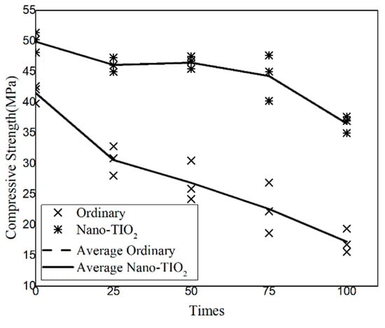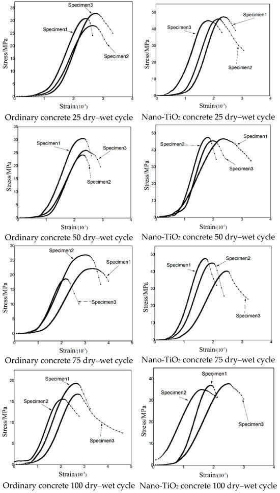 Figure 6 presents the compressive strength of different concretes after freeze–thaw cycles. As shown, the average peak compressive strength of both ordinary concrete and NTC exhibits a decreasing trend with increasing freeze–thaw cycles. Initially, the ordinary concrete demonstrated an average maximum compressive strength of 41.53 MPa, while the NTC group achieved 49.91 MPa—indicating a 20.17% enhancement due to the incorporation of nano-TiO2. After 100 freeze–thaw cycles, the compressive strength of the ordinary concrete decreased from 41.53 MPa to 17.25 MPa, a reduction of 24.28 MPa, with the most pronounced decline occurring within the first 25 cycles. In contrast, the compressive strength of the NTC specimens dropped from 49.91 MPa to 36.54 MPa, a reduction of 13.37 MPa, with the most significant decrease observed between 75 and 100 cycles. After 100 cycles, the reduction in compressive strength of the NTC specimens was 44.93% less than that of the ordinary concrete, highlighting their improved freeze–thaw resistance.
